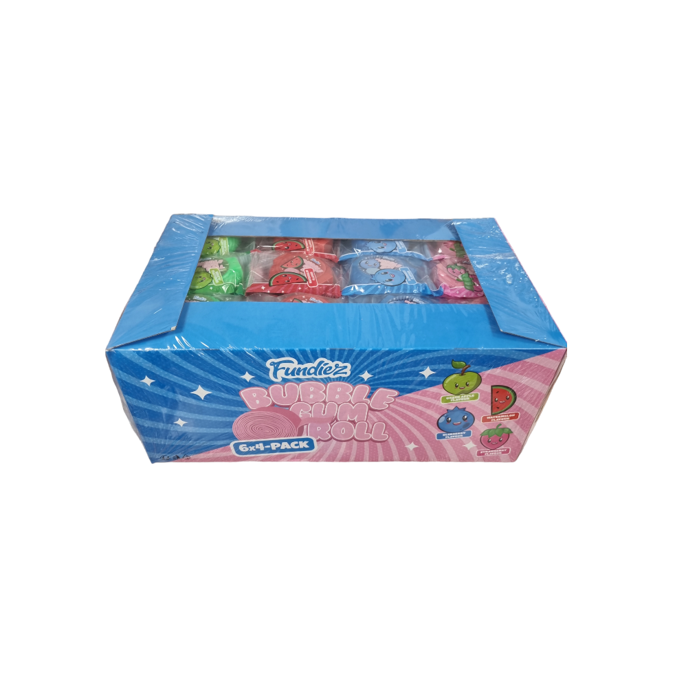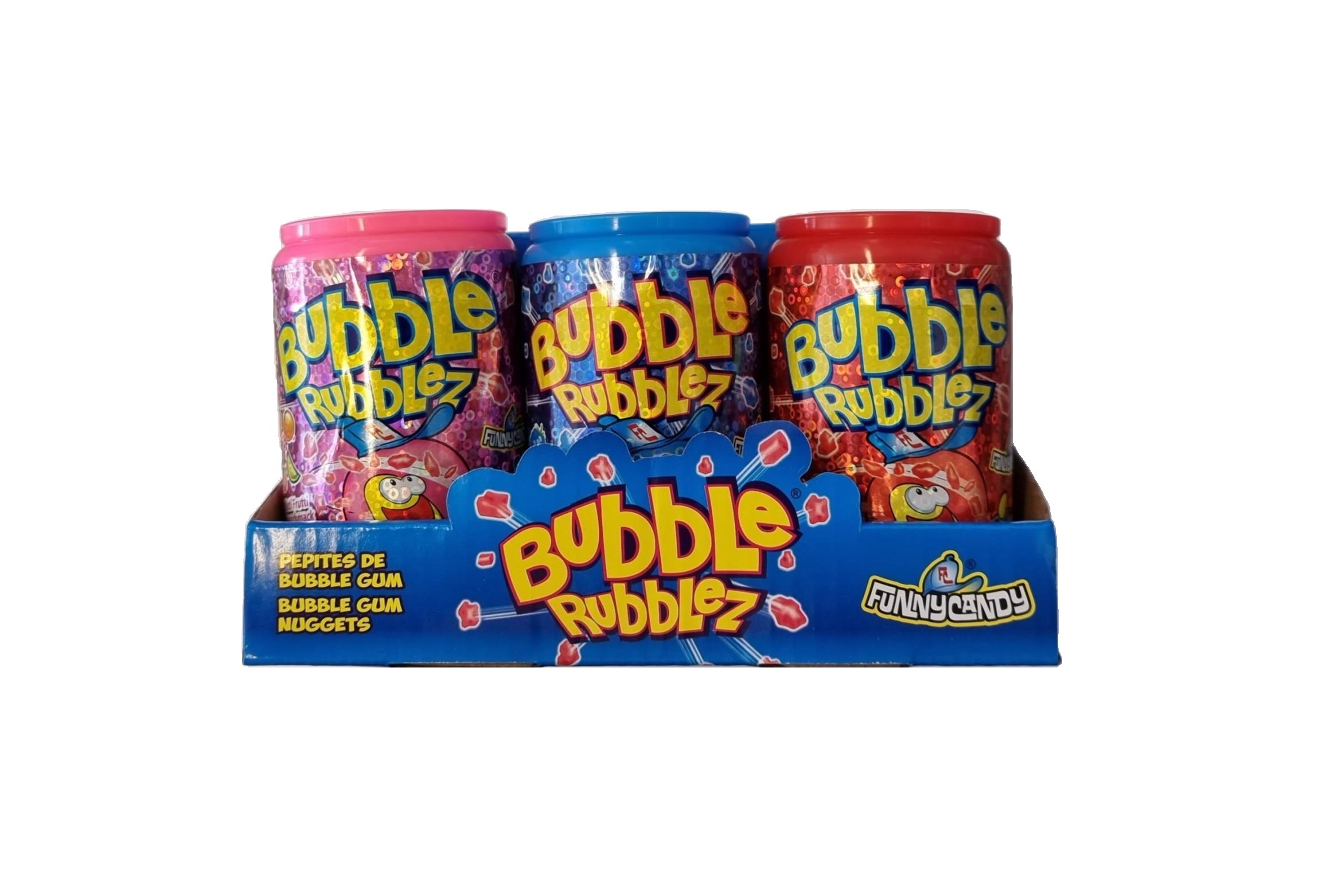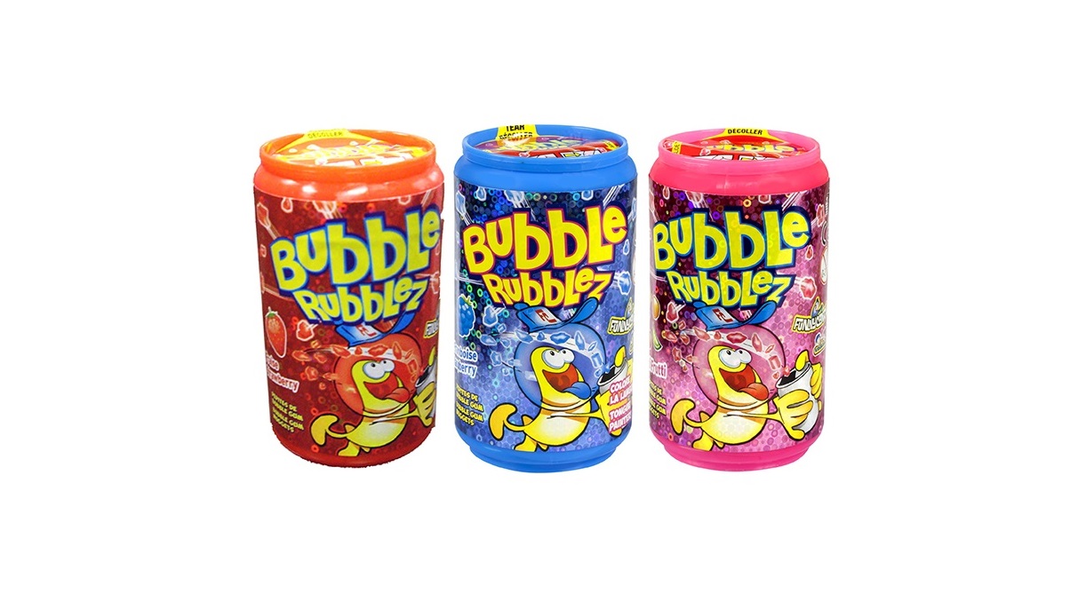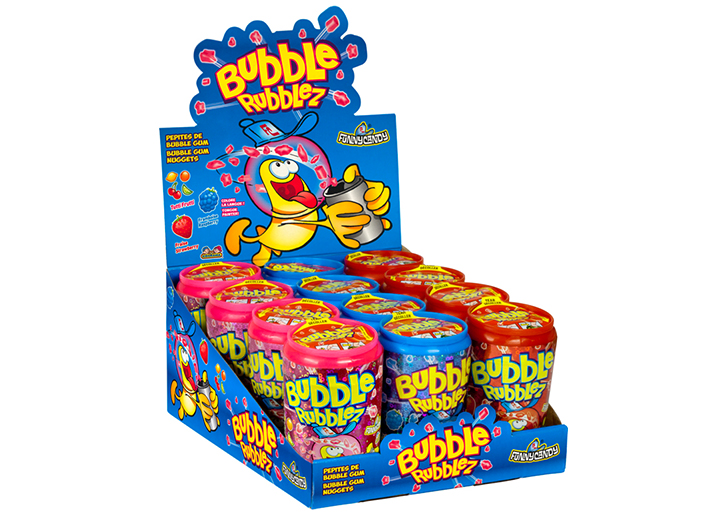 – présentoir de 12 Bubble rubblez, une canette remplie de bubble gum en morceaux